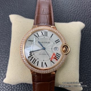 Ballon Bleu De Cartier 42mm RG Double Diamond Bezel White Dial Brown Leather Strap AF A2824