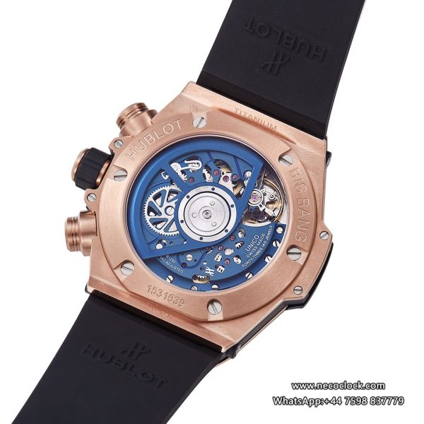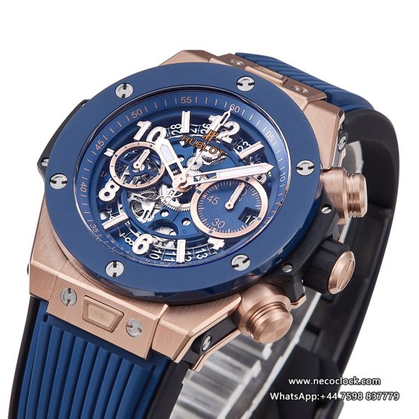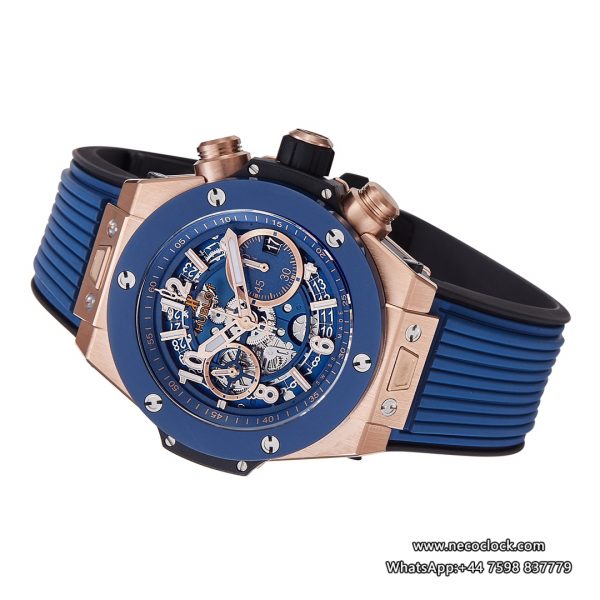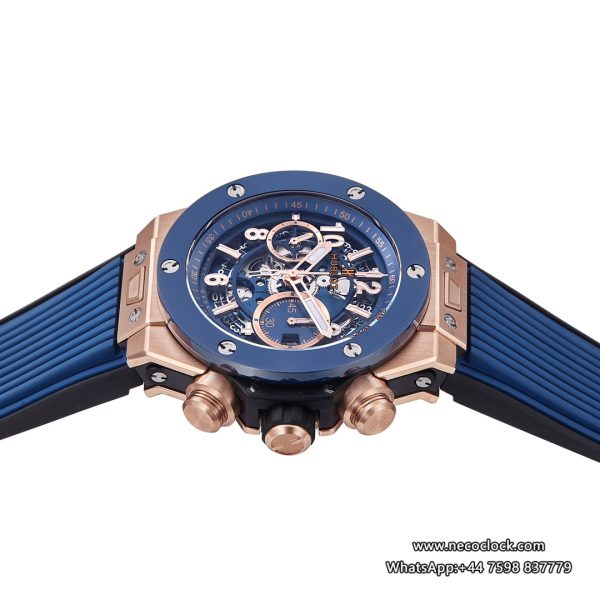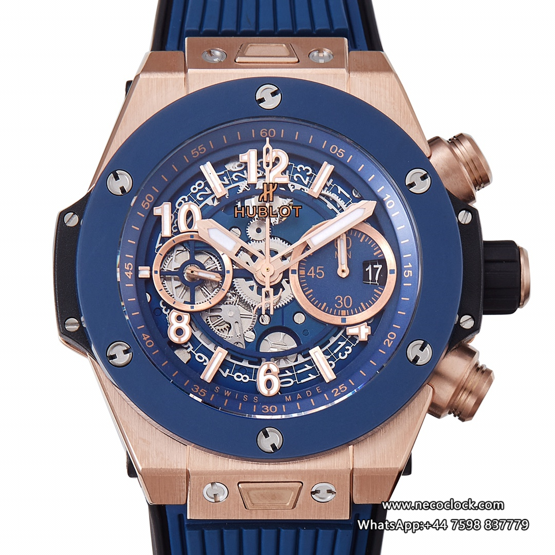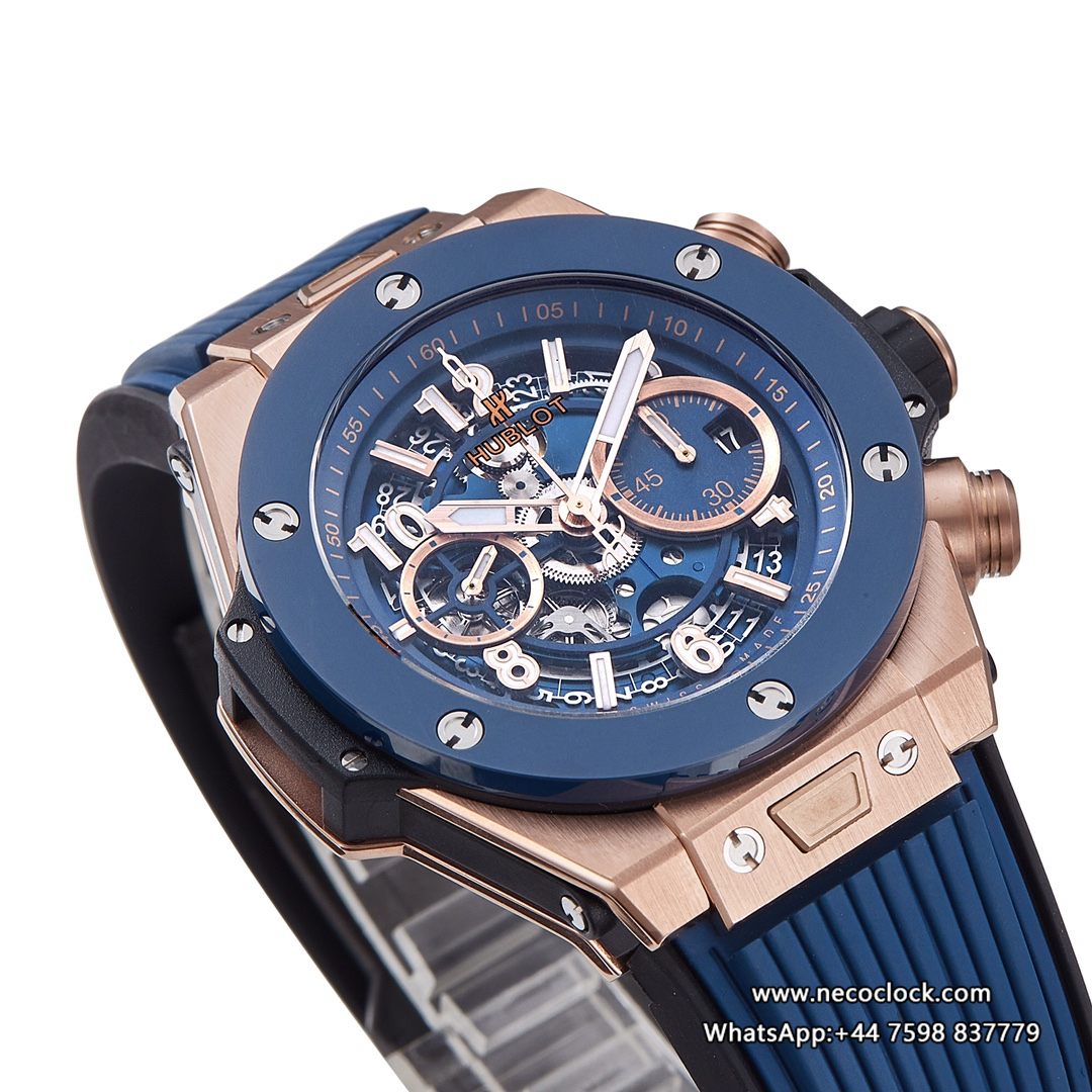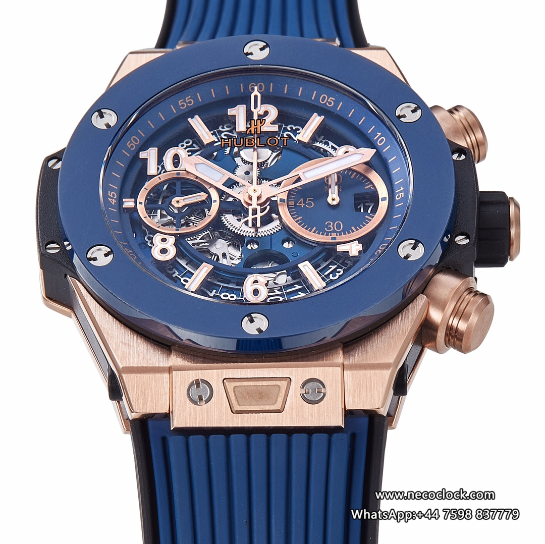 Big Bang Unico Chrono 42mm Blue Ceramic Bezel RG Blue Skeleton Dial Blue Rubber Strap BBF A1280
